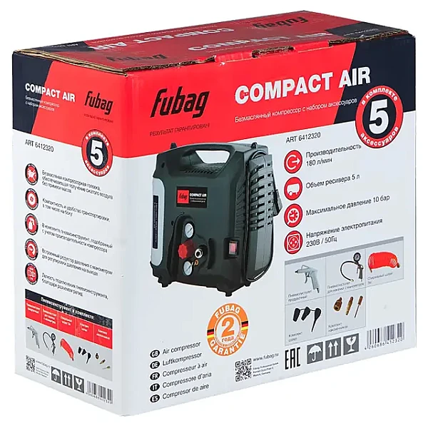 Купить Безмасляный компрессор FUBAG Compact Air + набор из 5 предметов в Тюмени легко — просто позвоните по телефону: 8-800-551-11-01