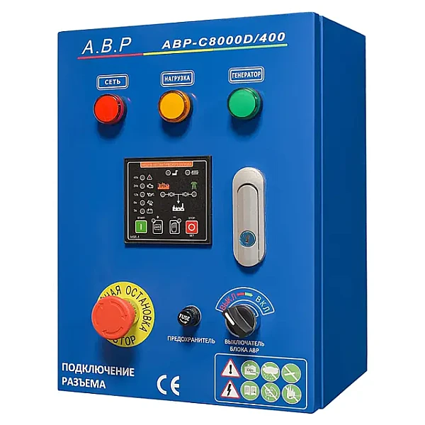 Блок АВР для дизельного генератора от 5 до 8 кВт/400 включает в себя систему автозапуска (автоматического ввода резервного электропитания). При появлении основного источника электропитания происходит отключение электростанции. Блок автоматического управления для контроля наличия напряжения в сети.
