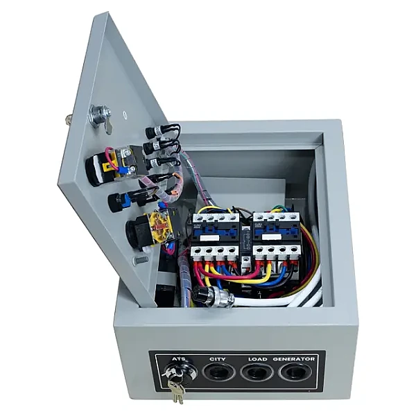 Выполненный в металлическом корпусе с классом пыле- и влагозащиты IP41, блок автоматического ввода резерва (АВР) Dinking 1/3-фазный может размещаться внутри или вне помещений. Для подключения к 8-контактному ATS-коннектору бензогенератора в комплект поставки включен 8-метровый сигнальный кабель. В качестве силовых коммутационных элементов в данном устройстве используются контакторы электромагнитного типа, которые обладают более высоким быстродействием, по сравнению с переключателями на основе мотор-привода. Режим работы системы АВР "ручной" либо "автоматический" и "летний" или "зимний" вариант запуска генератора устанавливается двухпозиционными поворотными переключателями на передней панели, где также размещены индикаторы, позволяющие визуально контролировать состояние системы электроснабжения.