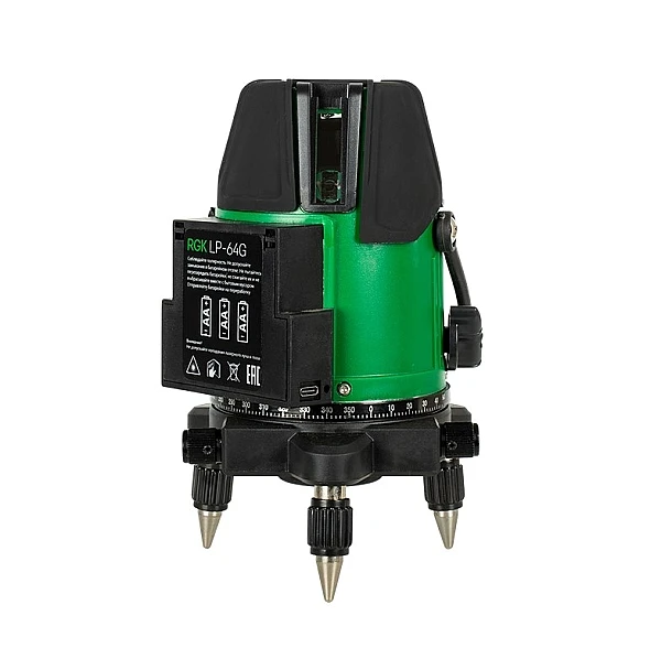 Лазерный уровень RGK LP-64G защищен от ударов и падений прочным прорезиненным пластиком. Кроме того, устройство изолировано от попадания водяных брызг и пыли и идеально подходит для работы на стройке. Для точной установки трегер устройства обладает тремя металлическими ножками с регулируемой высотой. Для работы со штативом в корпусе прибора предусмотрена крепление с резьбой 5/8".