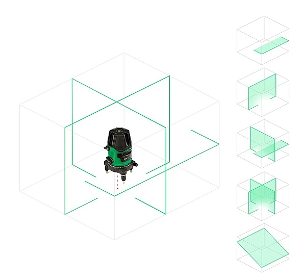 Нивелир проецирует пять линий: четыре вертикальных с развёрткой 120° и горизонтальную с углом в 110°. Вертикальные линии проецируются на 120° и заходят на потолок, формируя перекрестие над прибором. В сочетании с лазерным отвесом это позволяет использовать устройство для переноса точек по вертикали. Например, при разметке светильников. Управление осуществляется тремя кнопками: включения, переключения вертикальной и горизонтальной линий.