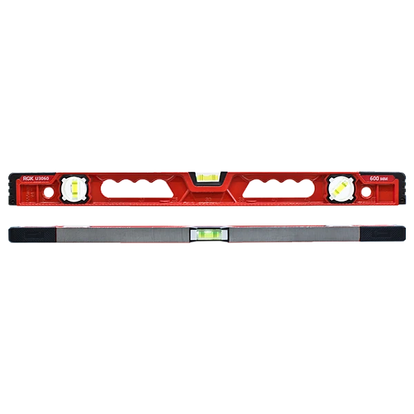 Магнитный уровень RGK U3060 длиной 60 сантиметров выполнен в прочном металлическом корпусе из литого профиля с резиновыми насадками, поэтому вы можете выравнивать поверхность ударами молотка непосредственно по уровню.