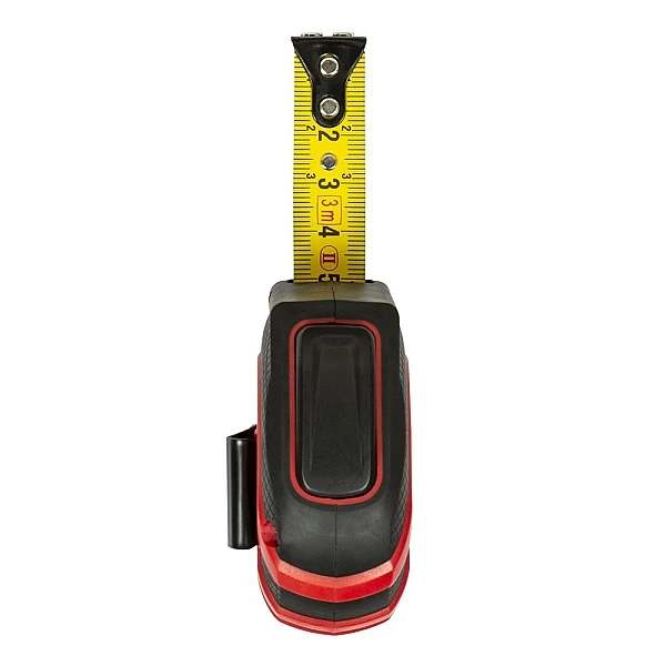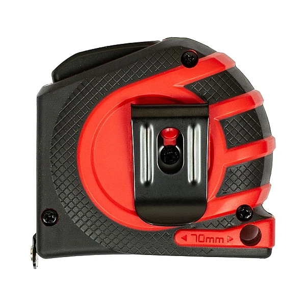Измерительная рулетка оборудована системой автоматической фиксации полотна при выдвижении. Для плавного и безопасного возврата ленты достаточно нажать большую кнопку, которой комфортно пользоваться даже в толстых перчатках. Специальная клипса позволяет закрепить инструмент на поясе так, чтобы он всегда был под рукой. Кроме того, предусмотрено отверстие для шнурка.